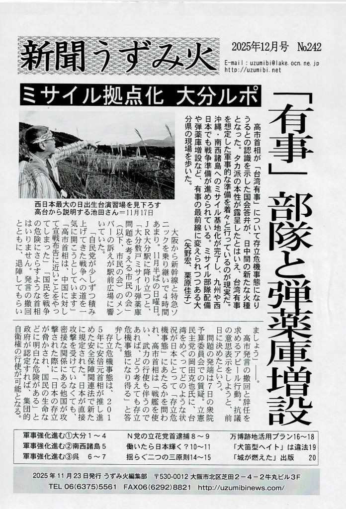 新聞うずみ火創刊20周年を迎え、11月1日にPLP会館で開かれた読者との祝う集い。執筆陣も駆けつけてくれ、心温まる励ましの言葉をいただきました。ありがとうございました。発刊は2005年秋、小泉政権による「郵政選挙」で自民党が300近い議席を取り、憲法が改悪されるとの危機感から。おかげさまで、今では北は北海道から南は西表島まで2000人を超える読者がこの小さな新聞を待ってくれています▼創刊20年を迎えた節目の年に誕生した高市政権。維新との連立もあり、最悪の政権となりそうです。早速、「台湾有事」について存立危機事態になりうると発言。日中関係は急速に冷え込みました。高市首相に撤回する気はないようで、改善の兆しはまったく見えません▼「高市発言は中国に対する宣戦布告と同じだ」との批判も飛び出しましたが、中国側の不信感や怒りはそれだけではないようです。南西諸島をはじめ、九州や西日本では台湾有事を想定した戦争準備が着々と進められています。大軍拡に私たちの税金が使われ、私たちの命が脅かされるなんて、こんなバカな話はありません▼祝園で、南西諸島で、そして大分で、政府が進める軍事要塞化に抗う人たちと出会い、勇気をもらいました。一人ひとりの力は小さいけれど、それぞれの胸にともる「埋火」がさらに燎原の火となると信じ、これからも一号一号積み重ねていきます。さあ、21年目に突入です。
