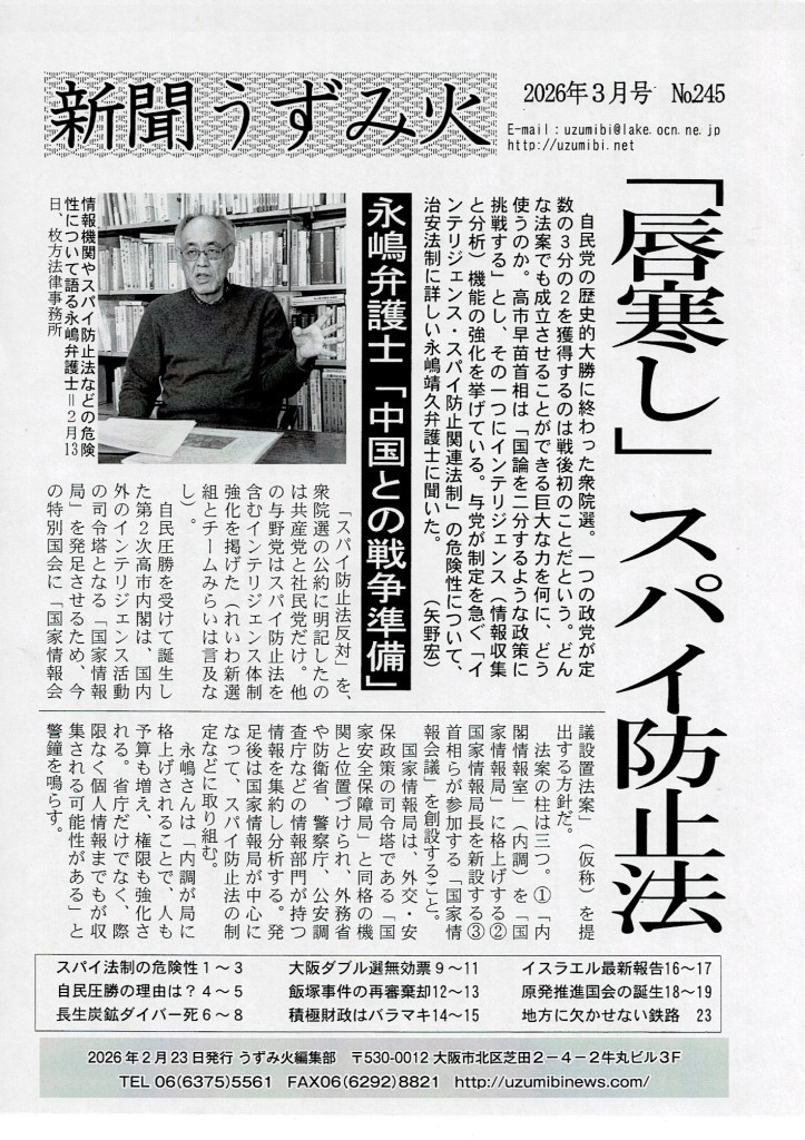 まずはお詫びから――。2月号の「あきれた大阪ダブル選」2ページの1段目に掲載した大阪府関係委職員労働組合の小松康則委員長の写真説明が間違っていました。紙面を組んでいく際、1月号の写真説明がそのまま残っていることに気づかなかったためです。申し訳ありませんでした▼「国論を二分するような政策に挑戦する」と公言した高市首相。復活させた旧安倍派の裏金議員らが担ぐみこしに乗り、右派的な政策を強力に推し進めていくことだろう。今月号で紹介したインテリジェンス体制の強化で「国家情報局」「日本版CIA」創設とスパイ防止法の制定、安全保障政策の抜本的強化で防衛費の更なる増額(GDP比3・5%)と殺傷能力のある武器輸出の解禁、原子力潜水艦の保有もささやかれている。非核三原則の見直し、そして改憲も――▼「国会で何とかなる」時代は終わった。「大阪都構想」を二度止めた大阪からこれからも発信し続けます。あきらめへんで。 (矢)
