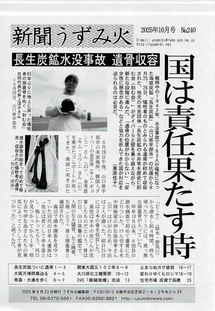 山口県宇部市の長生炭鉱は、太平洋戦争中に水没。朝鮮半島出身者を含む183人が犠牲になり、遺骨は炭鉱内に取り残されたまま。市民団体「長生炭鉱の水非常を歴史に刻む会」がダイバーとともに潜水調査を行い、8月に坑道の中から人の頭や足などの骨を見つけ出したことは、今月号で栗原が紹介した。