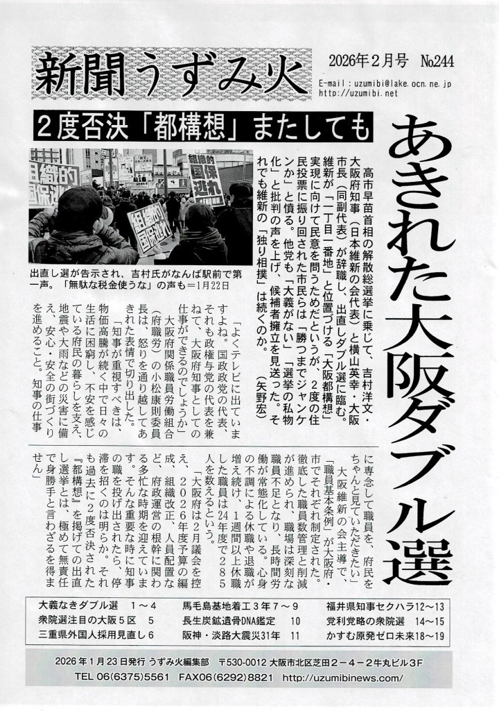 前回の「大阪都構想」をめぐる住民投票の時、自民党選出の堺市議に「維新のどこが嫌いか」尋ねたことがある。その市議は「平気でうそをつくところ」と即答し、こう説明した。「うそをつかれると議論にならない。民主主義の崩壊につながります」▼高市首相は「物価高の中で、新年度予算と税制改正関連法を早期に成立させる」と説明していたのに一転、解散総選挙に踏み切った。その理由が「高市早苗が首相で良いのか、国民に決めていただく」。白紙委任せよとでもいうのか▼自分勝手な政治家は大阪にもいる。任期途中で知事を辞任し、市長も伴って大阪出直しダブル選を仕掛けた維新の吉村氏。都にもならないのに、また「都構想」実現に向けて民意を問うと1月22日に第一声をあげた。6年前、2度目の住民投票が否決された後、「僕たちが掲げてきた大阪都構想は間違っていた」「政治家として大阪都構想に挑戦することはもうない」と明言したのは誰やねん▼立憲民主党も新党「中道」に衣替えするや、これまで掲げてきた「安保法制の違憲部分の廃止」「原発ゼロ社会を一日も早く実現」の方針を投げ捨ててしまった▼かつて明治維新から3代目の世代が国家権力の中枢を握り、無謀な太平洋戦争へ突入し日本を滅ぼした。戦争を知らない3代目世代が選挙をもて遊び、再びこの国を滅ぼそうとしている。2月8日、うそをつかない政治家を選びたいものだ。 (矢)